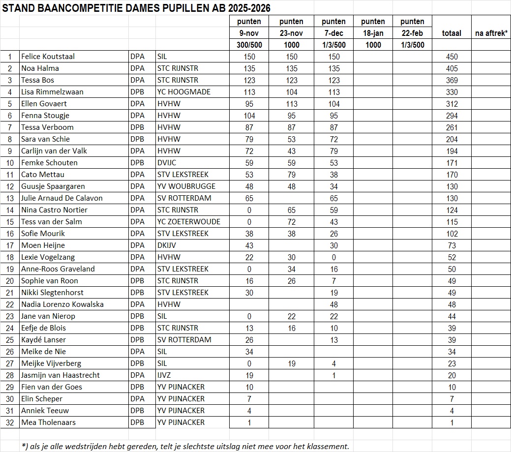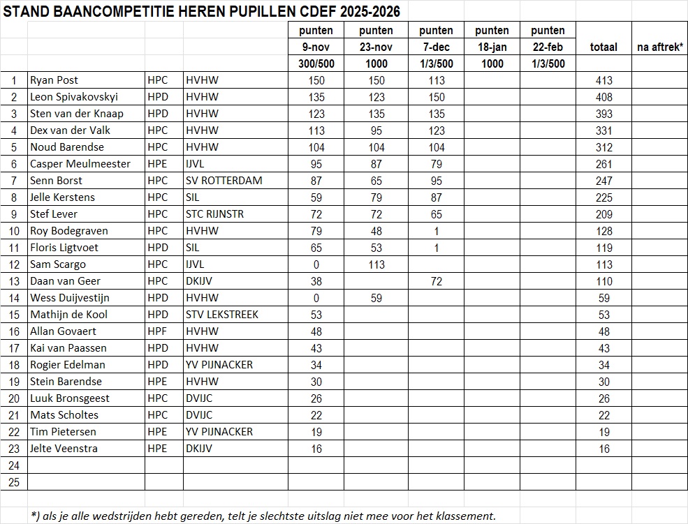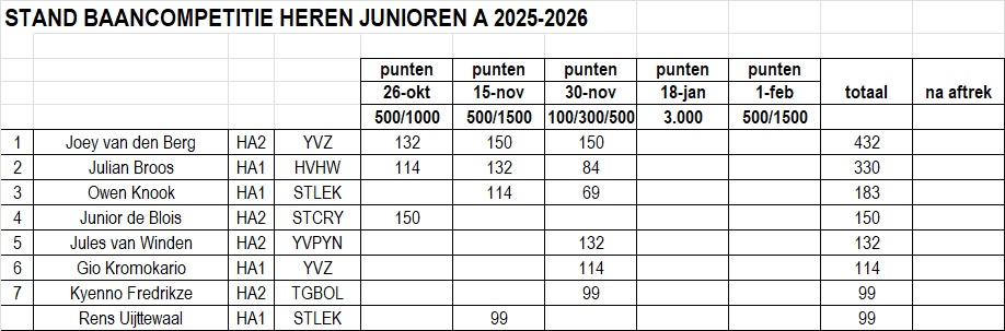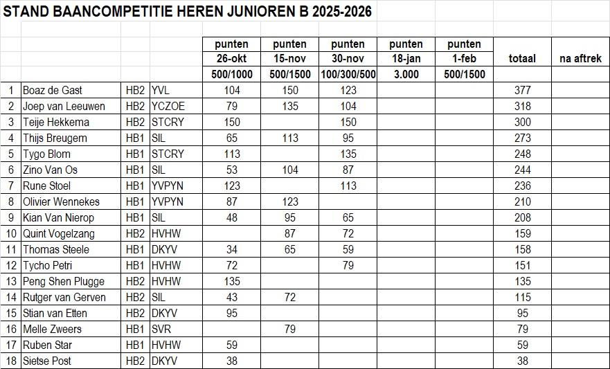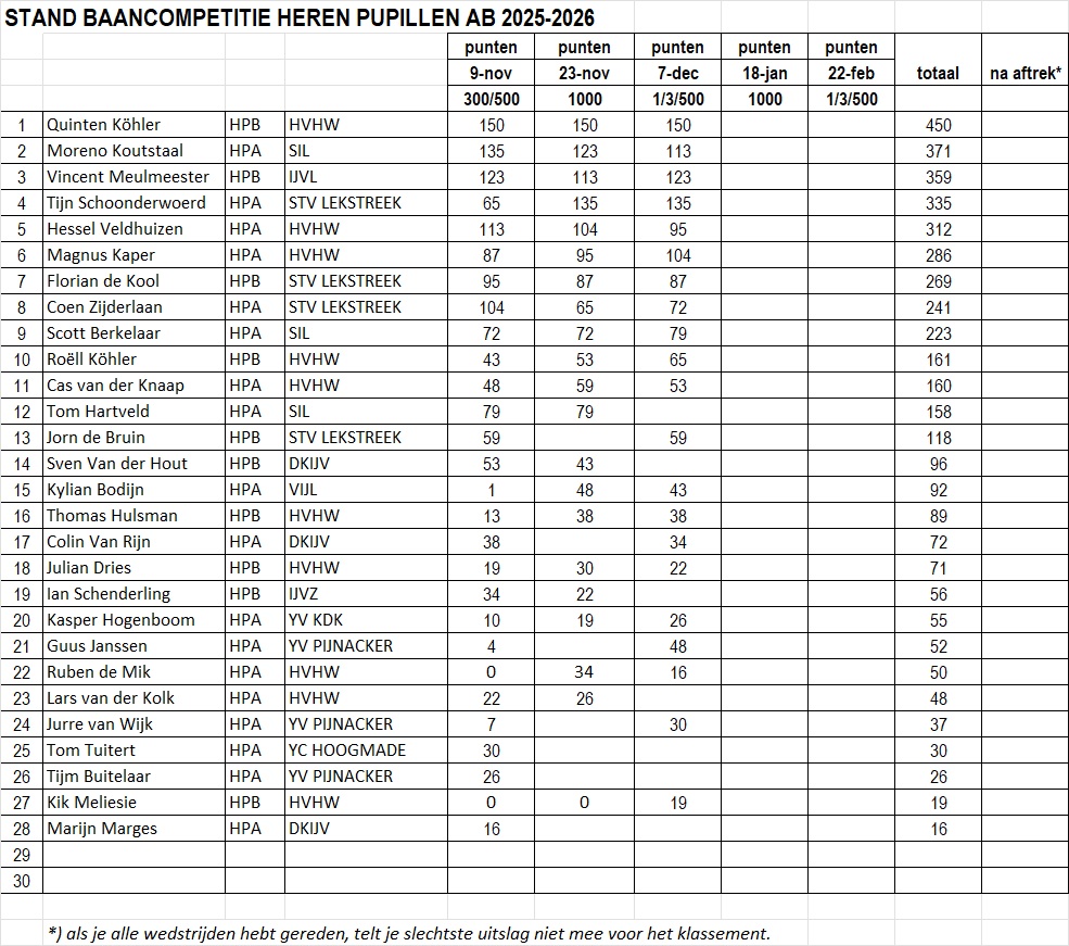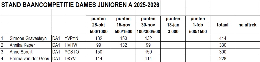 4 januari ’26 – Dit seizoen is er voor alle leeftijdcategorieën weer een volledige baancompetitie, met 4 of 5 wedstrijden per leeftijdsgroep. Op deze pagina verschijnen steeds de tussenklassementen van de competitie. Per vandaag zijn alle klassementen bijgewerkt.