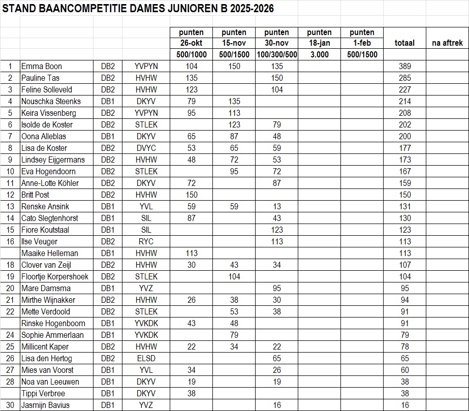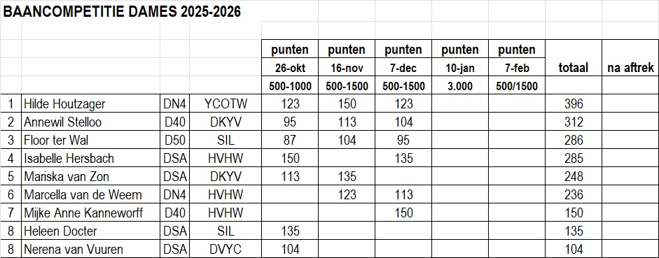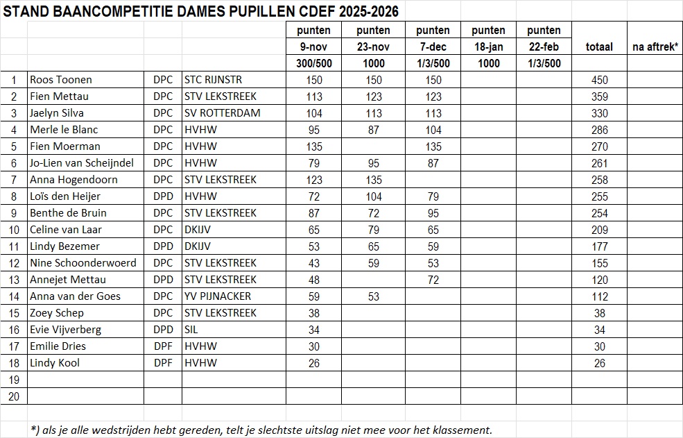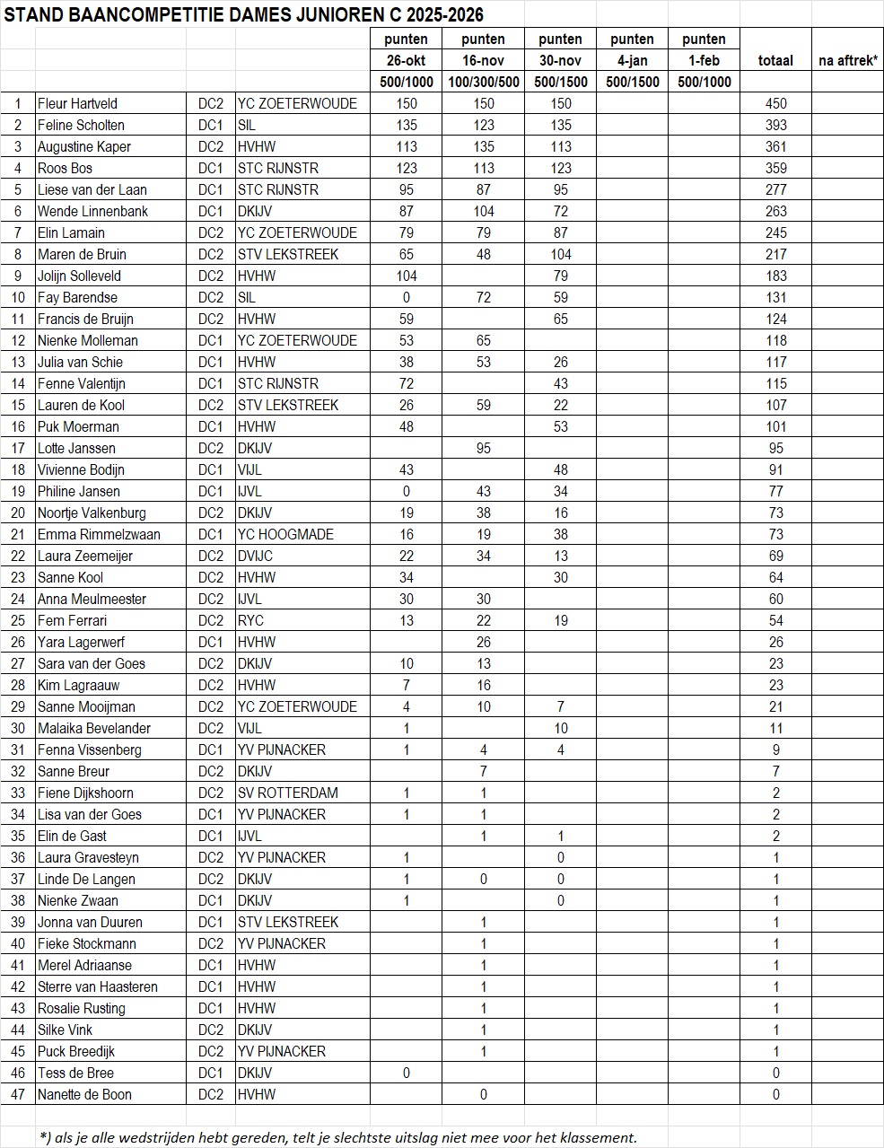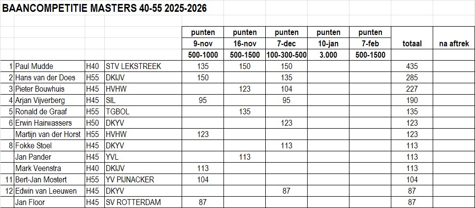 4 januari ’26 – Dit seizoen is er voor alle leeftijdcategorieën weer een volledige baancompetitie, met 4 of 5 wedstrijden per leeftijdsgroep. Op deze pagina verschijnen steeds de tussenklassementen van de competitie. Per vandaag zijn alle klassementen bijgewerkt.