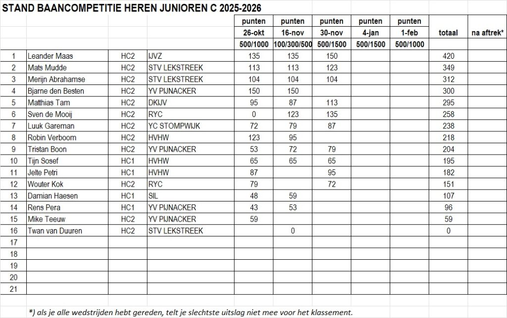 NB: Aan het einde van het seizoen zullen klasse-1-rijders mee rijden in de baancompetitie, zij zullen echter niet meetellen in de puntentelling van het baancompetitie klassement.